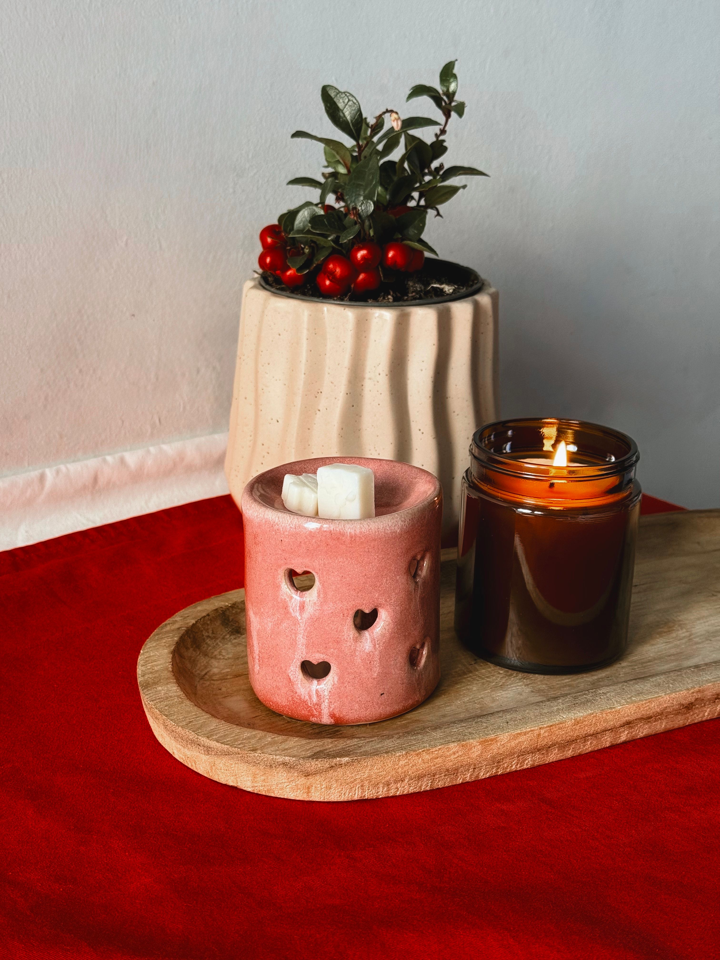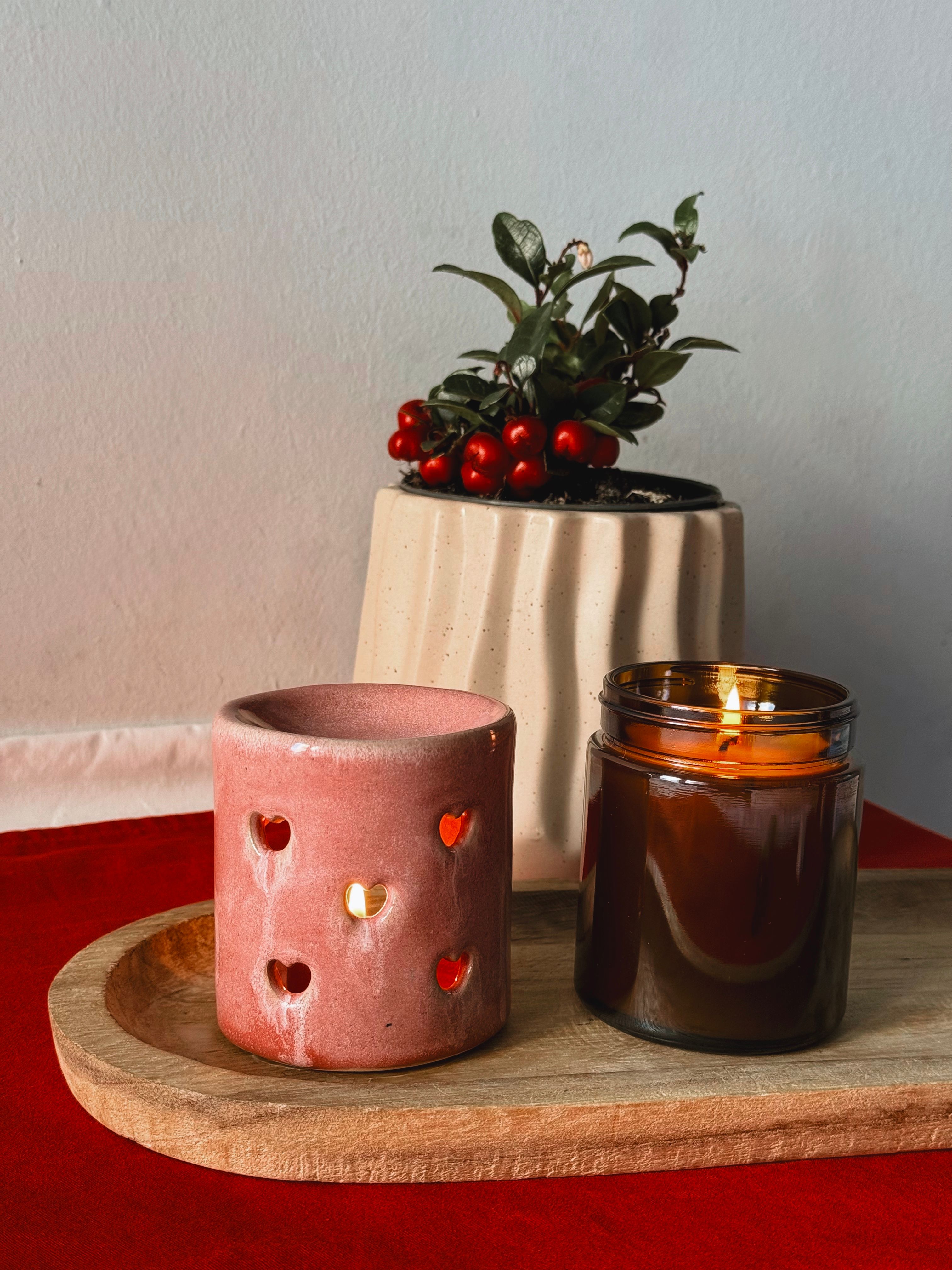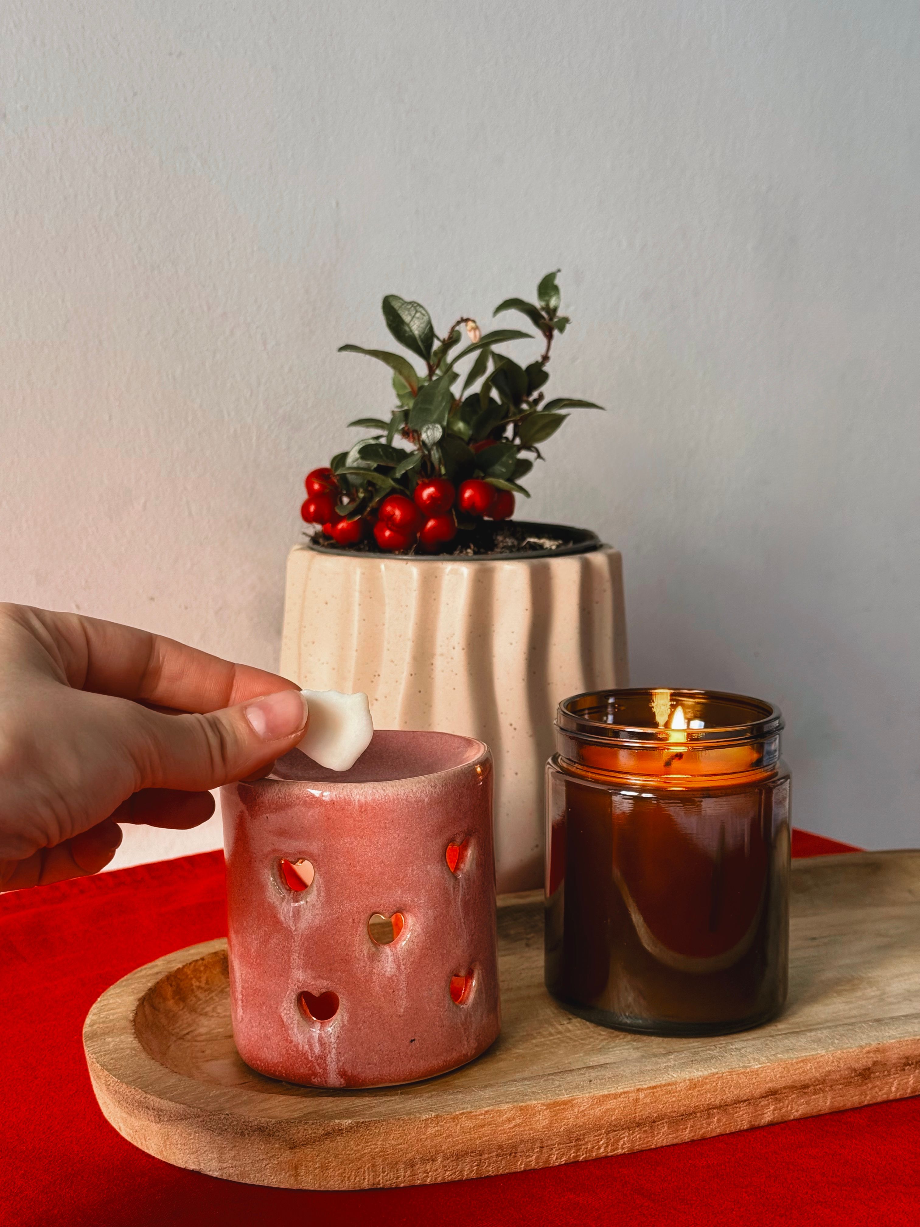 Σε ζεστή ροζ απόχρωση, με κομμένες καρδούλες στα τοιχώματα που αφήνουν το φως του κεριού να περνά, δημιουργεί ατμόσφαιρα αγάπης, χαλάρωσης και low-key romance. Ιδανικός για wax melts και αιθέρια έλαια, γεμίζει τον χώρο με άρωμα, ενώ παράλληλα λειτουργεί σαν μικρό διακοσμητικό αντικείμενο που τραβάει το βλέμμα.