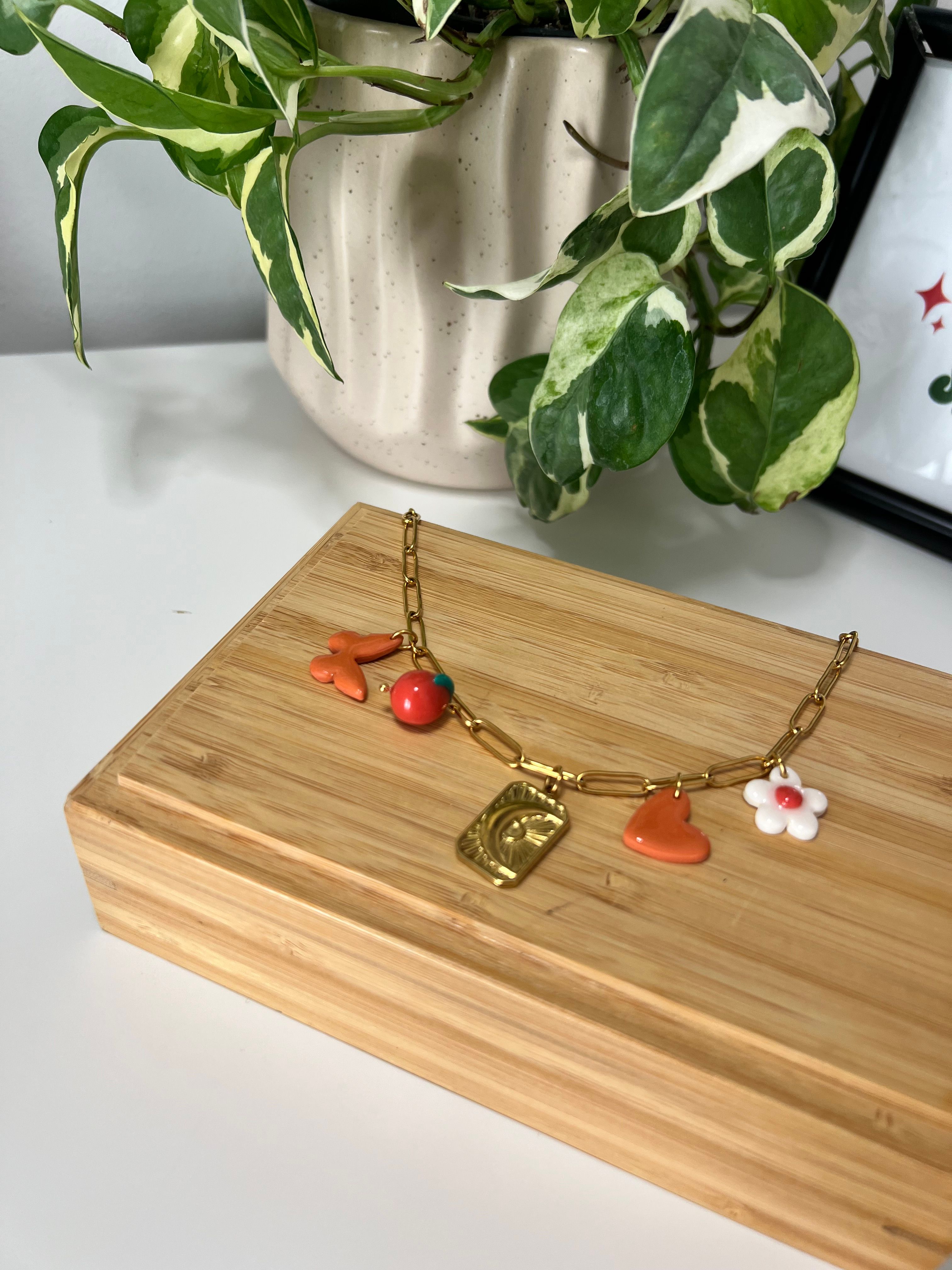 Αυτό το charm necklace μυρίζει άνθη πορτοκαλιάς και βόλτες στη θάλασσα. Με handmade charms από πολυμερικό πηλό και ατσάλινα στοιχεία, μπορείς να το φοράς όλη μέρα και έτσι να λάμπεις κάθε στιγμή. Καλοκαιρινό, φρέσκο και με φουλ λαμπερή διάθεση.
