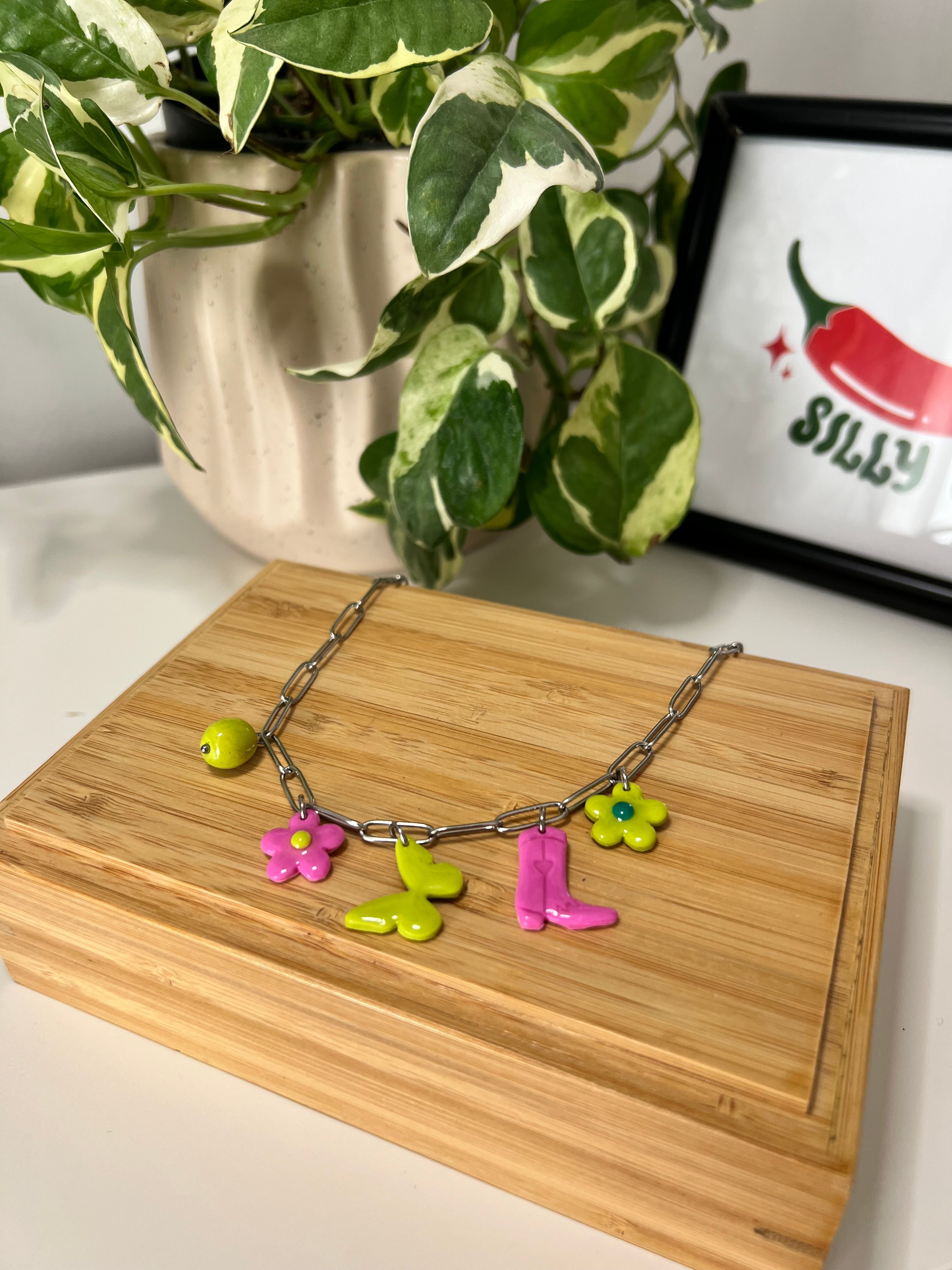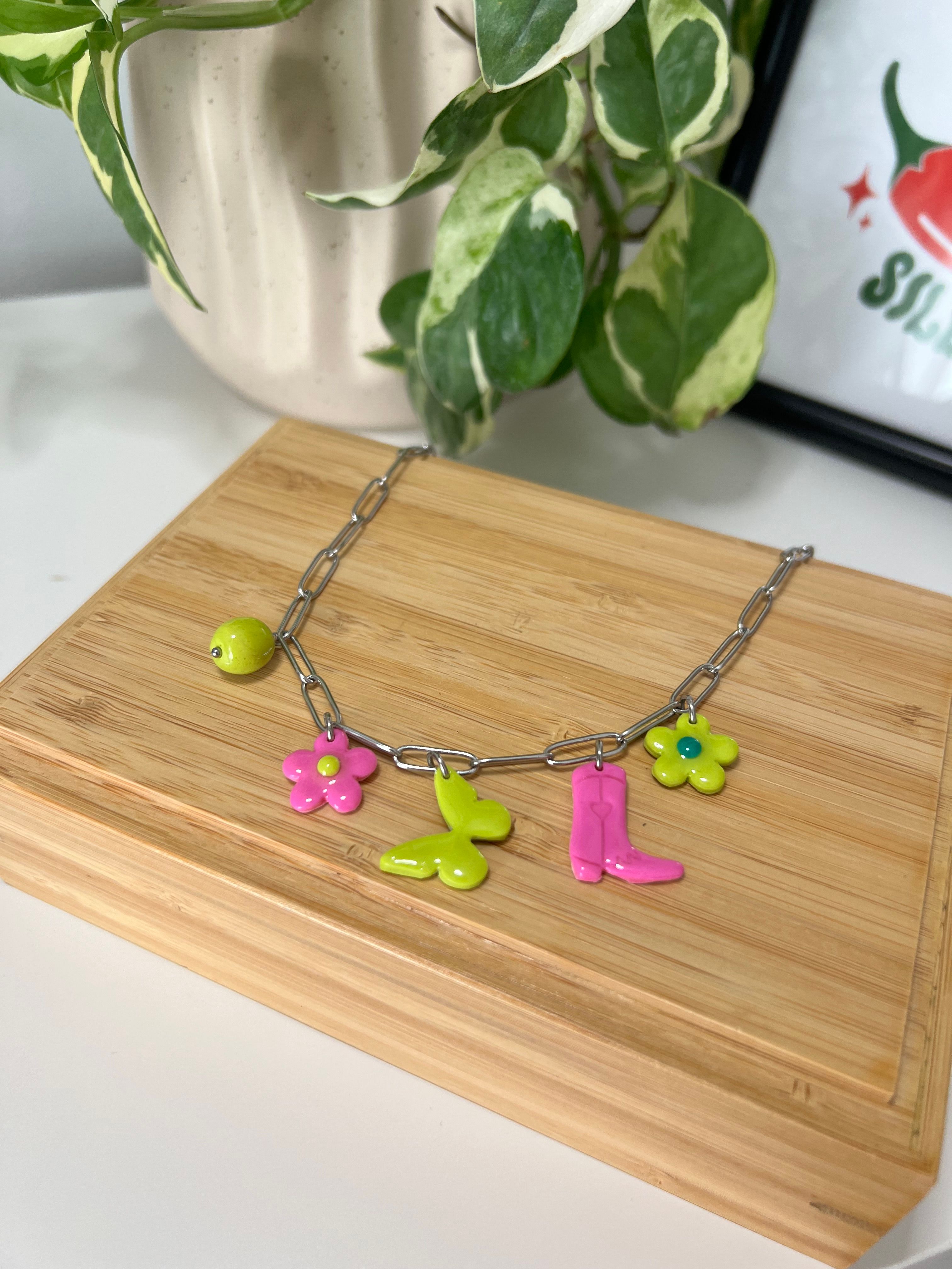 Αυτό το charm necklace, με handmade charms από πολυμερικό πηλό και ατσάλινα στοιχεία, είναι το τέλειο mix bold & fun. Ο συνδυασμός ροζ και lime, θα φέρει καλοκαιρινά vibes σε κάθε σου outift, από το πρωί για καφέ μέχρι το βράδυ για παλόμες και σουσου!