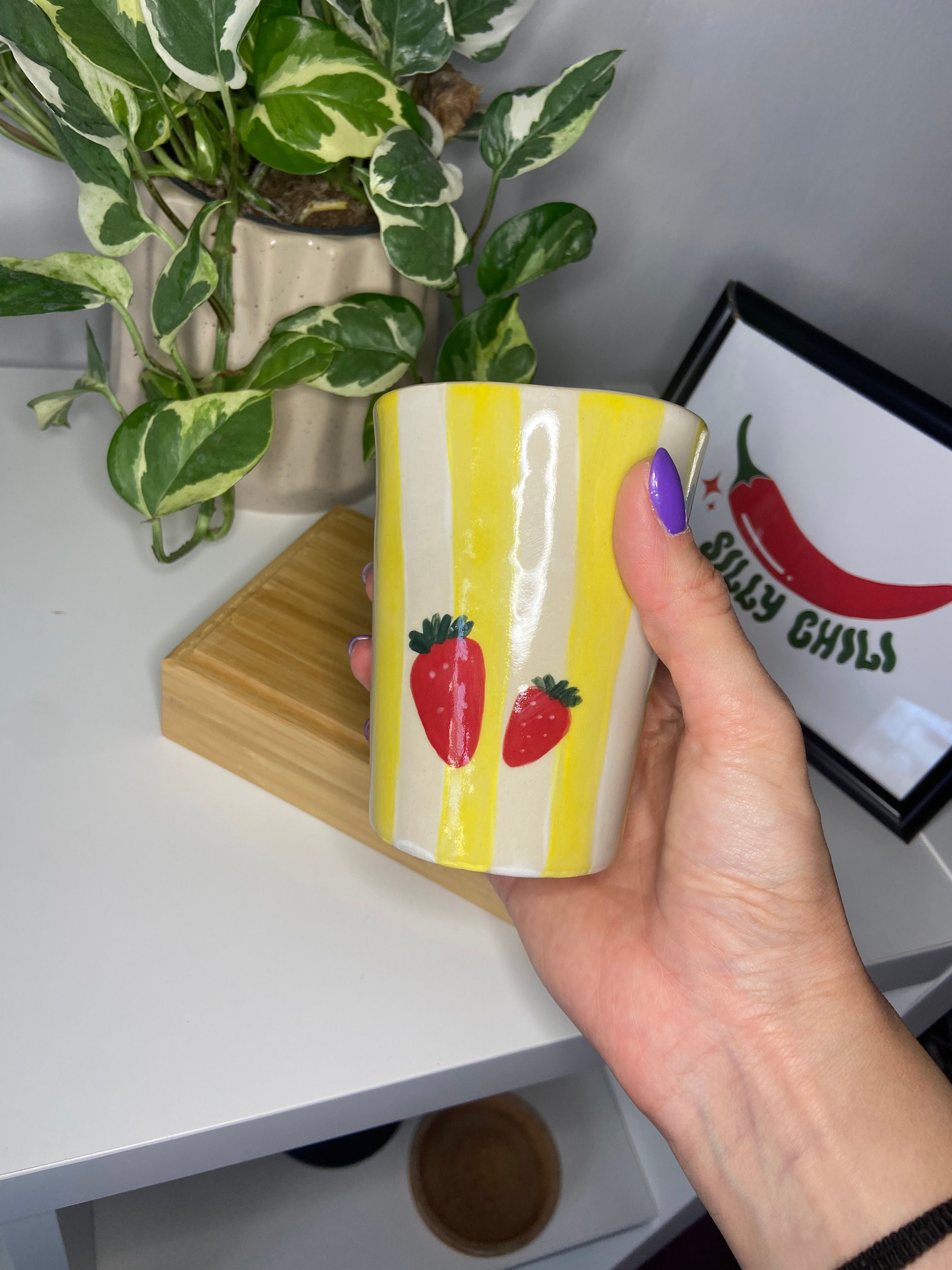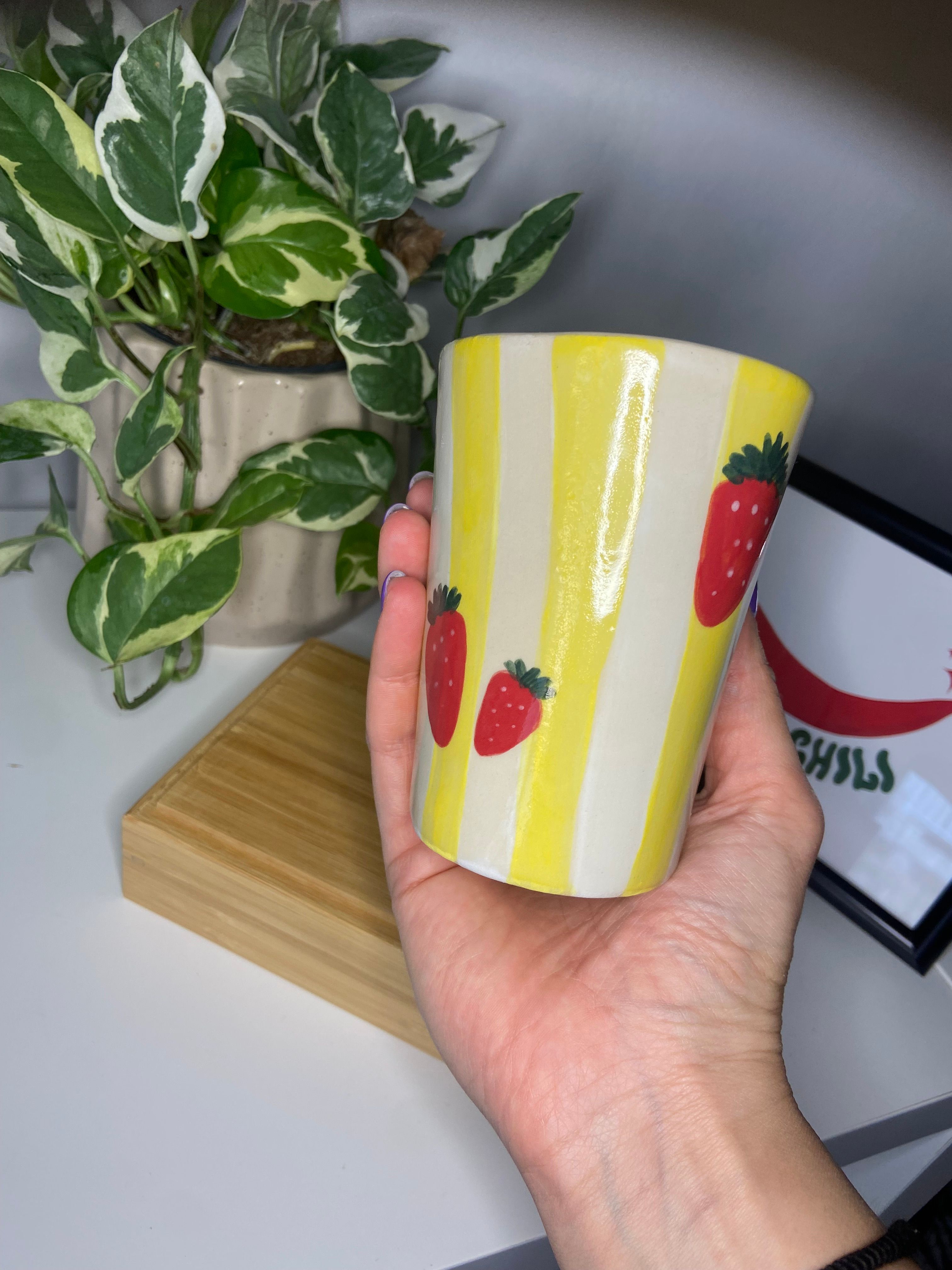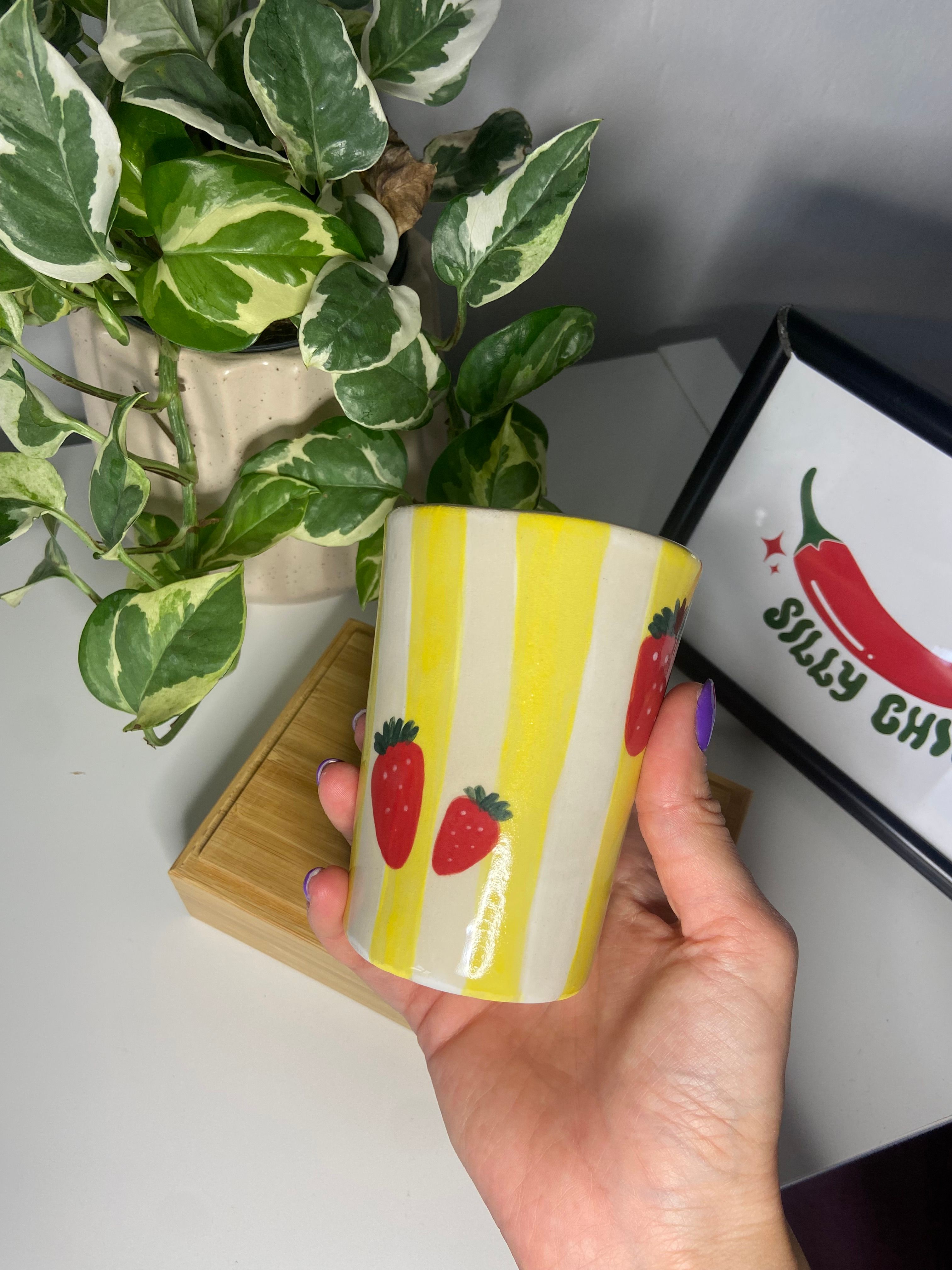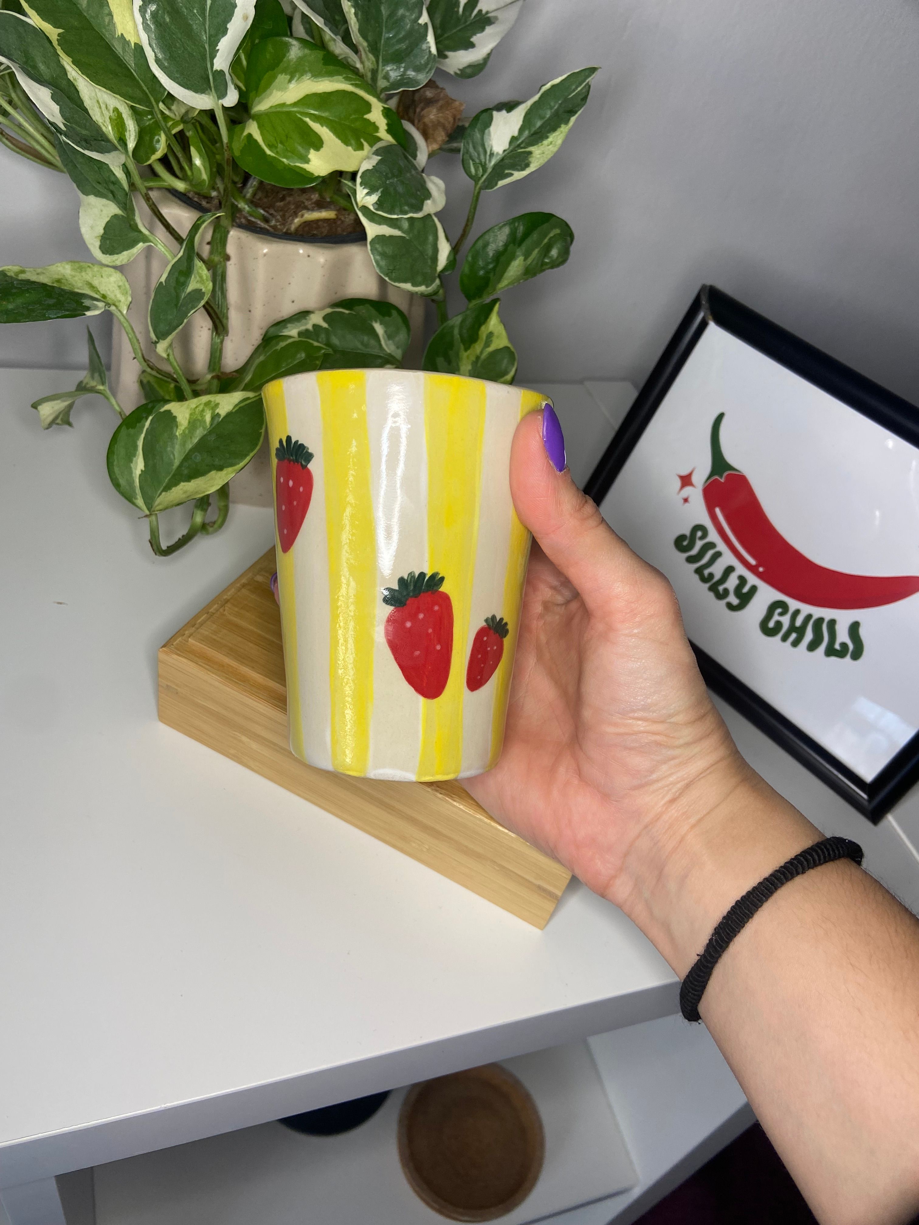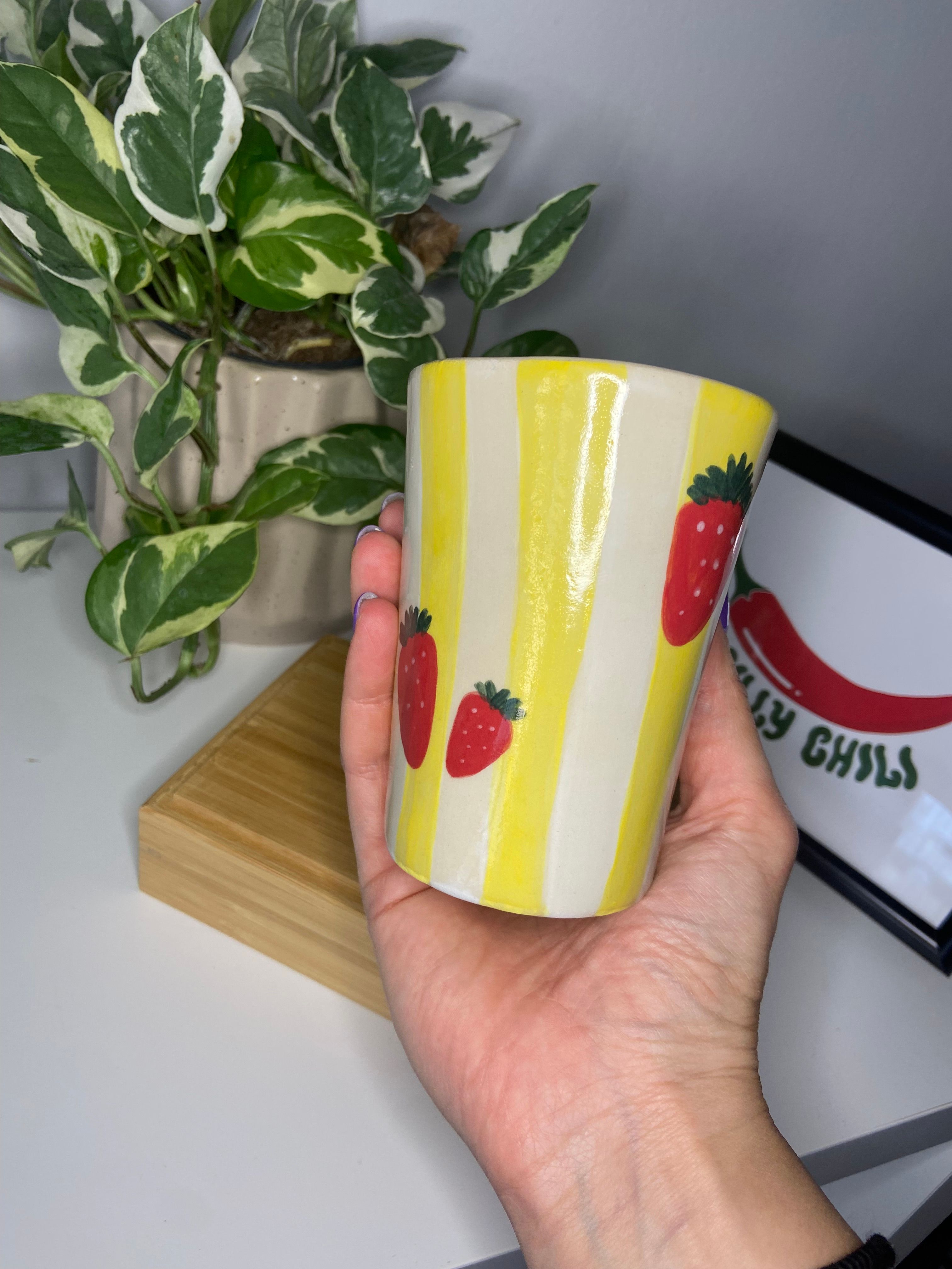 Το Strawberry Pop είναι χειροποίητο με κίτρινες ρίγες σαν ηλιαχτίδες και δροσερές φράουλες για cuteness overload. Από το πρωινό σου smoothie μέχρι ένα δροσερό cocktail, αυτό το ποτήρι είναι εδώ για να κάνει τη μέρα λίγο πιο cute.